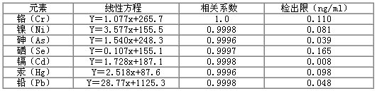 Hg±êÒºµ¥¶ÀΪһ×é¡£Cr ¡¢Ni ¡¢As ¡¢Se ¡¢Cd ºÍPb ±êÒºÓø÷ÔªËØ10¦Ìg/mLµÄ±êҺϡÊÍÖÁËùÐèŨ¶È¡£ÅäÖÆHg±êҺʱ¼ÓÈë0.1mL 20 ¦Ìg/mL½ð±ê×¼ÈÜÒº¡£ÆÊÎö½á¹û(±í2)ÏÔʾ£¬Õâ7ÖÖÔªËØµÄÏßÐÔ·½³ÌµÄÏà¹ØÏµÊýΪ0.9996¡«1.000 £¬¼ì³öÏÞΪ0.008¡«0.165ng/mL¡£